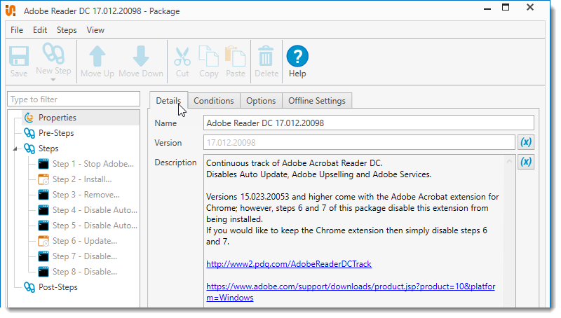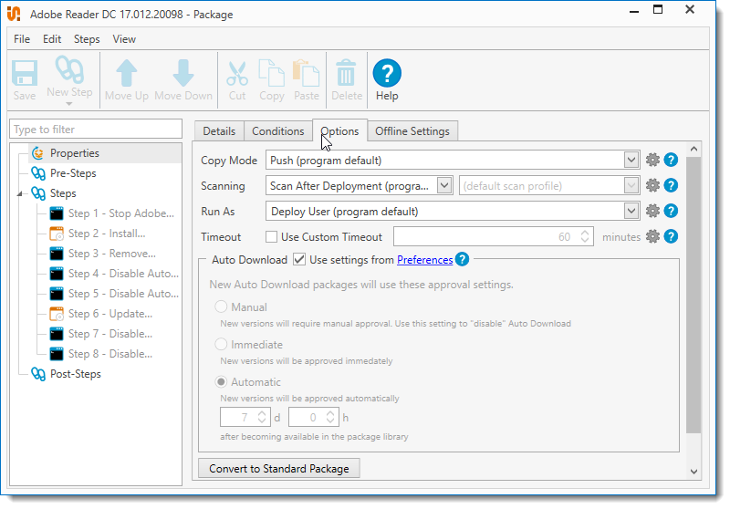 Use this to convert to a Standard package that will no longer auto download new versions. Once converted all Pre and Post Steps will be converted to regular steps. WARNING: This option cannot be undone. |