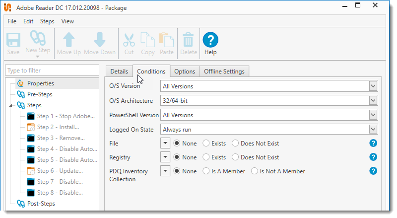 Use this condition if you want to make sure a target computer is or is not a member of a certain collection in PDQ Inventory before running the package. IMPORTANT: This requires both PDQ Inventory and PDQ Deploy in Enterprise mode. For the integration to work properly with Central Server, both products will need to be installed on the same console with both running in either Server mode or Client mode. |