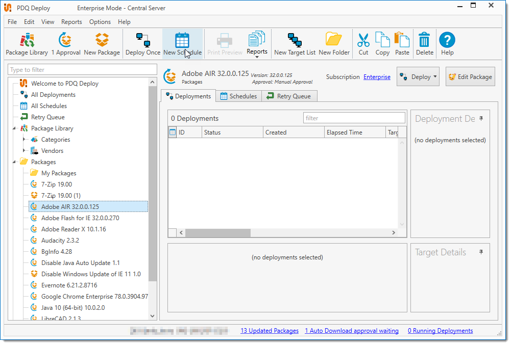 NOTE: The Package Library refreshes every 2 hours and every time PDQ Deploy opens. You also can manually refresh the library on the Main Console window (click View > Refresh or press F5). When Auto Download packages are updated in the Package Library, PDQ Deploy starts counting down (according to the approval policy) to the time when they are automatically updated. PDQ Deploy displays auto download package updates waiting to be approved in the status bar. For information about the Approval Policy, see Modifying the Approval Policy and Manually Approving an Auto Download.