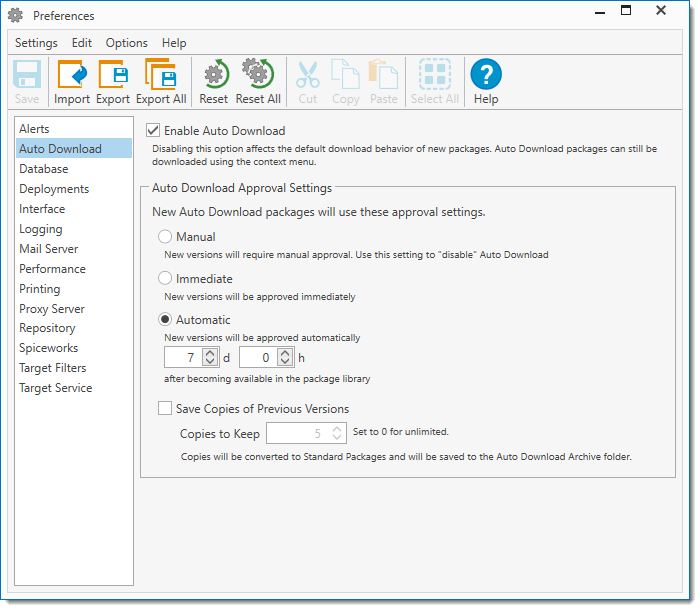 IMPORTANT: Changes made to the global settings will update all packages you have already downloaded that have not previously overridden the global approval policy within the package. If you have pending Auto Download Approvals they will be approved based on the new settings.