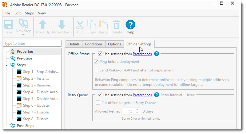 Enable or disable the Retry Queue and modify the number of retries for the package. The default settings for Retry Interval, and several other settings for offline computers, can be modified in Preferences > Deployments. Important: Requires Enterprise mode to use Retry Queue settings. |