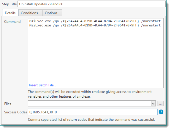 This will attach a batch file to your package and call that file from within the Command Step. The included file will be listed in the Files section of the step. |