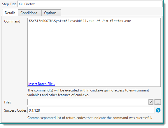 Command(s) are executed the same as the Install Step with one difference: the command specified must exist on the target computer, or be added via the Additional Files option. The example shown below runs the taskkill.exe utility. Note that taskkill.exe is not copied down to the target; rather, the Command Step expects it to exist in the path specified.