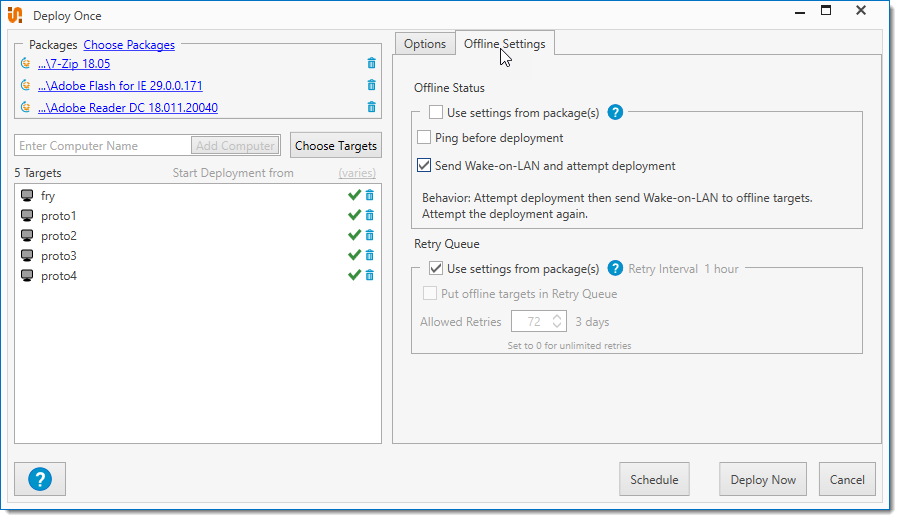 Retry Queue settings determine how PDQ Deploy handles deployments when the target computers are offline. |