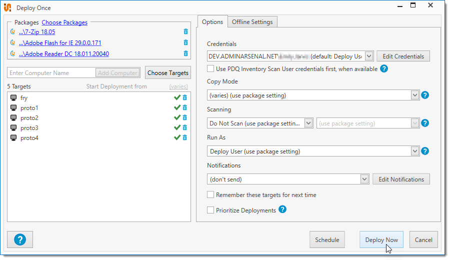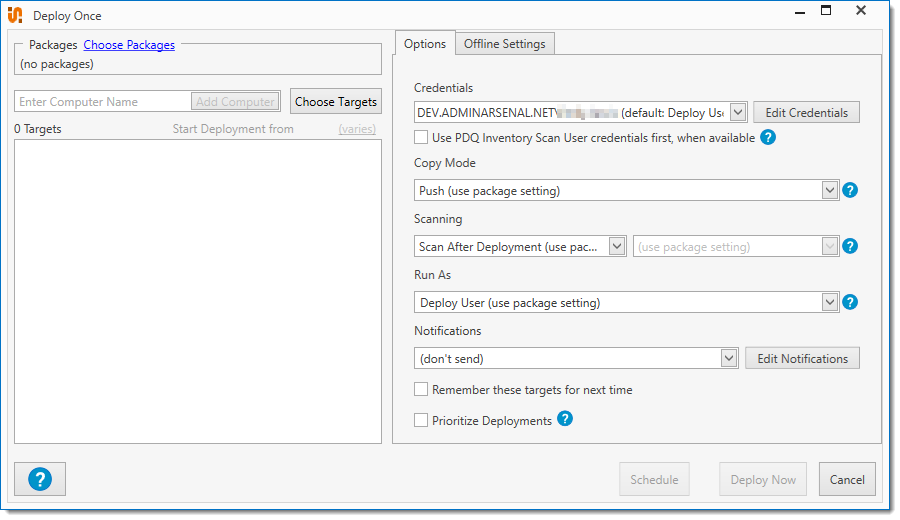 Allows PDQ Inventory's Scan User credentials to be used during the deployment. If selected, the PDQ Inventory Scan Users credentials will be used first. If no Inventory Scan User credentials exist for that target computer, the selected PDQ Deploy credentials will be used. NOTE: Local Administrator Password Solution (LAPS) can be used by if the target computer's selected Scan User credentials are configured properly to use LAPS. IMPORTANT: Enterprise mode is required in both PDQ Deploy and PDQ Inventory. If running in Client or Server mode, PDQ Inventory must also be in Client or Server mode. NOTE: This selection is saved for use the next time you start a new deployment with this window. |