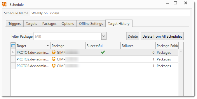 To open the Schedule Window, select the schedule and double-click it (or right-click and select Edit Schedule, or press Ctrl+O). The graphic below shows the Target History tab of the Schedule window for two deployments.