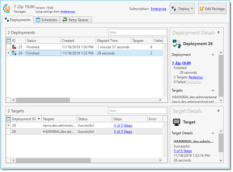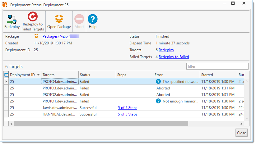 Right-click a deployment and select Redeploy (or press Ctrl+R) or Redeploy to Failed Targets (or press Ctrl+Shift+R). Deployments can be redeployed to all targets, selected targets, or to all failed targets. This creates new deployments. If more than one deployment is selected to redeploy to all failed targets and those deployments are from different packages, then one new deployment is created for each package. |