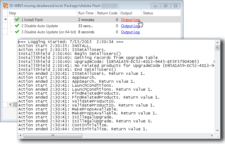 Click a Step link to view the status info for each step in the package. Click Output Log to view the details for a step.