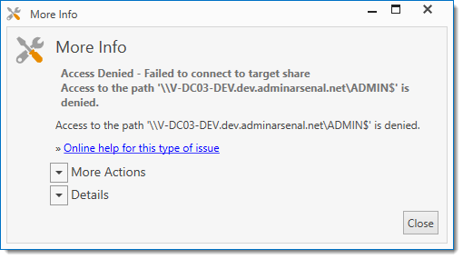 Click to open the More Info window, which shows the reason for the failed deployment and provides links to additional details and possible solutions.