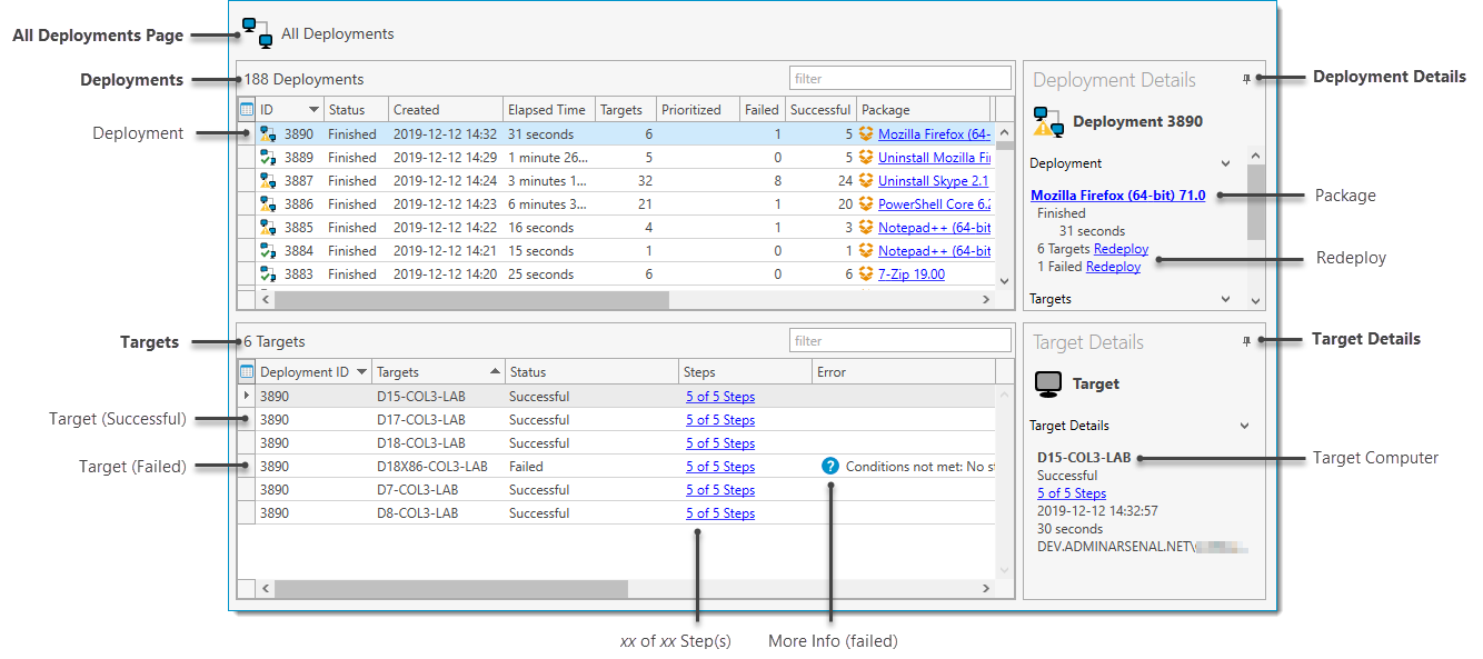 To view the All Deployments page, on the Main Console window, select All Deployments in the tree. The graphic below shows the All Deployments page with its components called out.