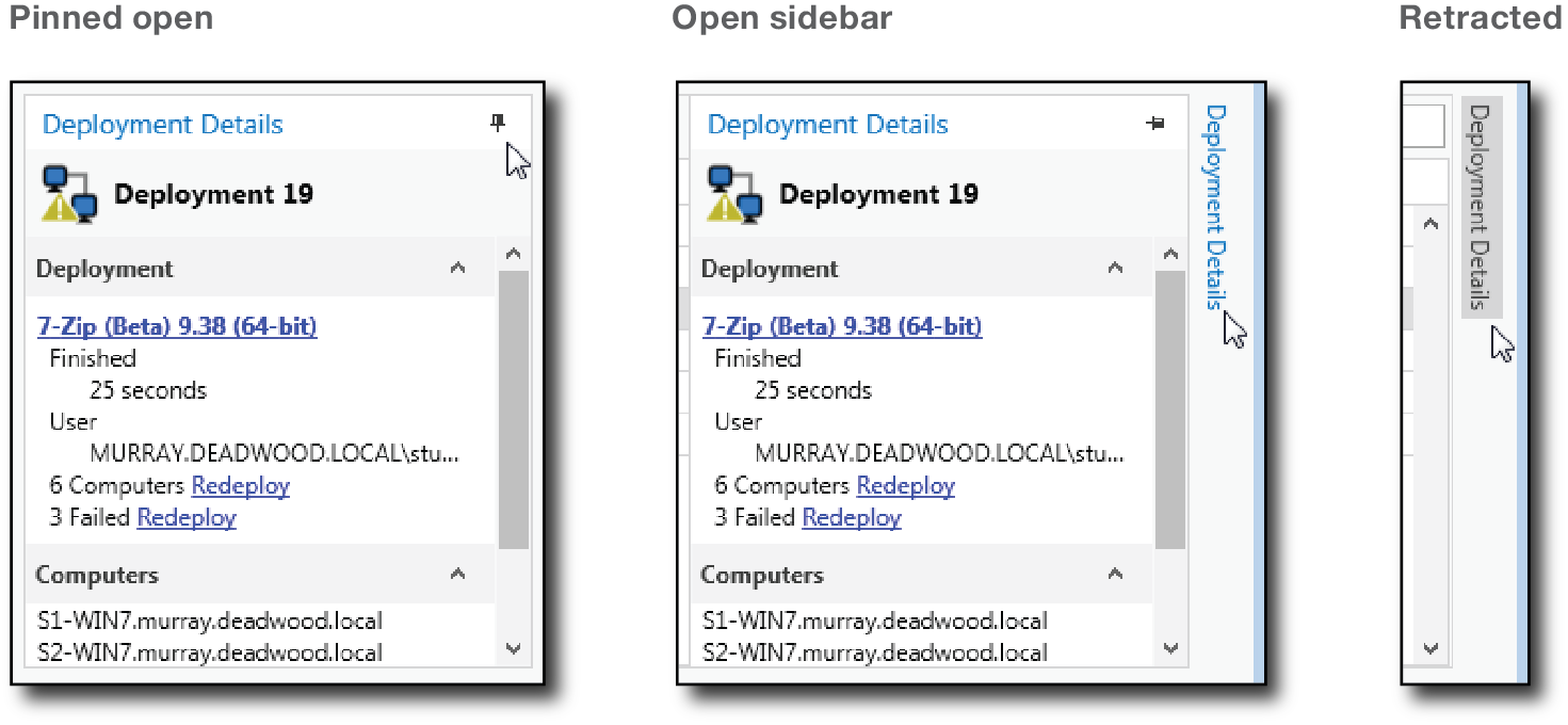 The sidebars of detailed information on the right side of various pages (for example, Deployment Details and Target Details on the All Deployments page) can be viewed in a number of ways. The following graphic shows the three states of the sidebar.