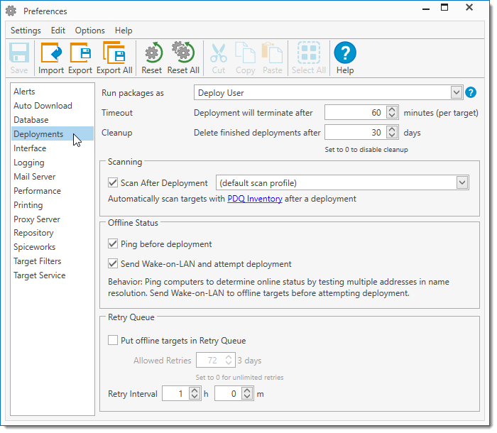 The Preferences menu provides a centralized location for PDQ Deploy program settings. Preference settings define general program defaults, so they apply globally to all PDQ deployments unless overridden within specific packages or deployments.