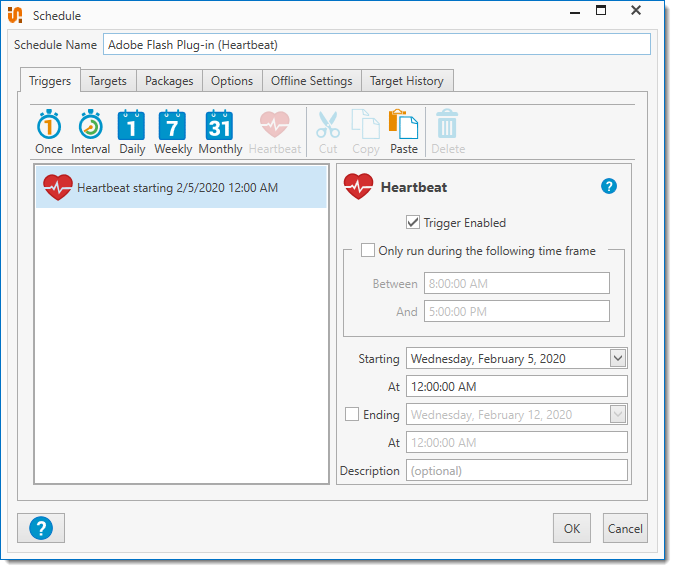 For this example we are scheduling a Heartbeat deployment of the Adobe Flash plug-in package.