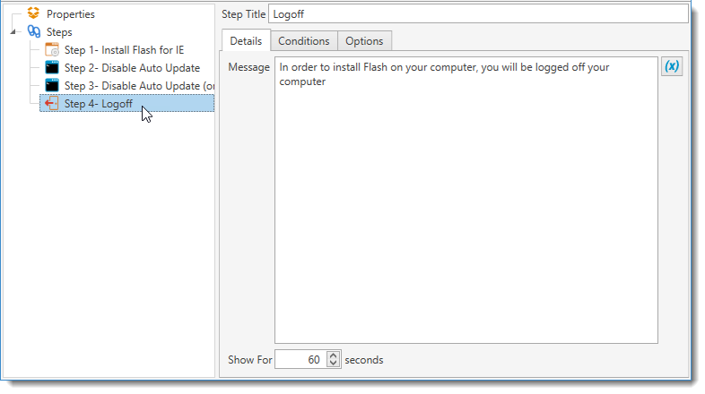Type in the message you want to display in the Message window on the Details tab. If no Message is entered, then the Show For timer is grayed out and the log off takes place immediately. |
