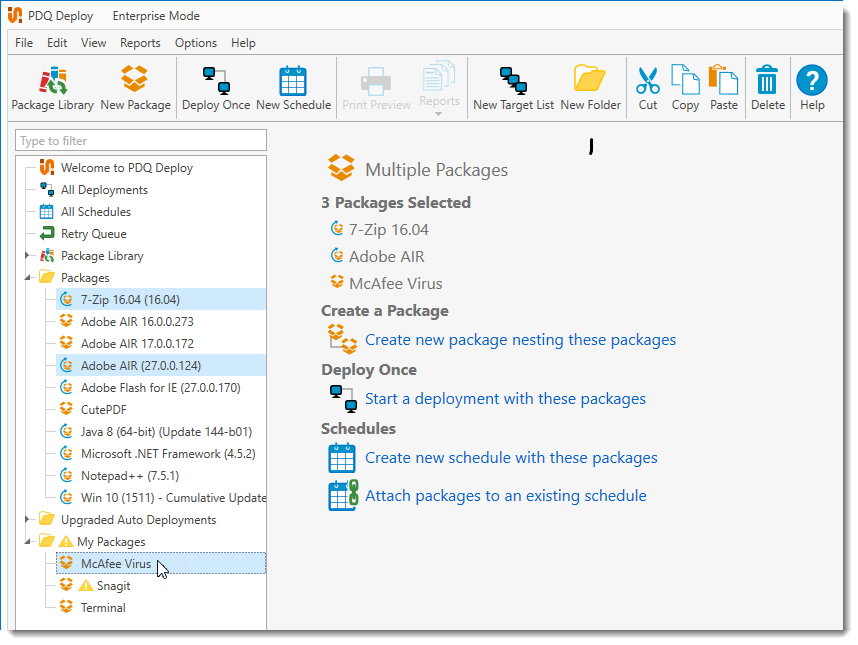 •Create new schedules with these packages: A new Schedule window opens for all selected packages. For details, see Creating Scheduled Deployments.