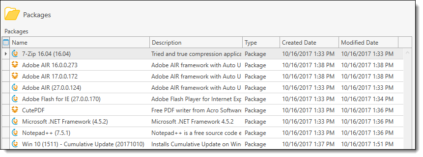 Click the Packages folder in the tree to view the packages downloaded into your system on the Packages page. The list shows the package name, package type, and the created and modified dates.