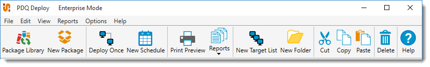 The File, Edit, View, Reports, Options, and Help menus provide commands and controls for the components and content you create and edit in PDQ Deploy. The Toolbar provides quick, context sensitive access to selected commands.