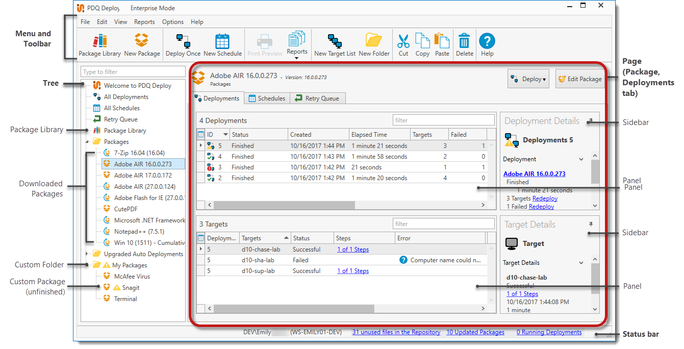 The tree contains all of the packages, deployments, schedules, target lists, and custom folders in your PDQ Deploy system. You can also access the PDQ Deploy Package Library from the tree.