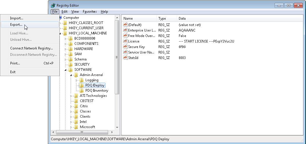 d.Copy the HKLM\Software\Admin Arsenal\PDQ Deploy key to the desktop on the new system.