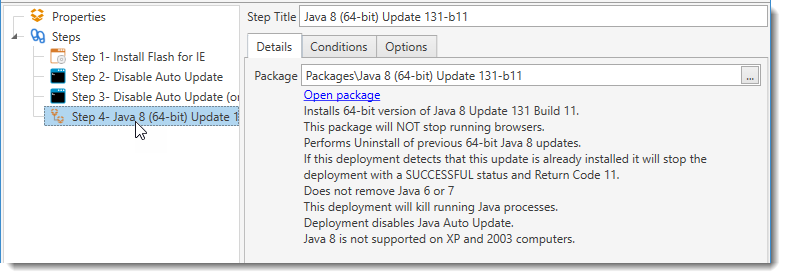Conditions and Options step properties interact with a Nested Package Step a bit differently than with other steps.