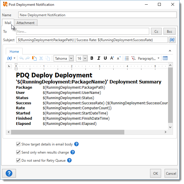 Provides full details of the deployment in email and an attached file (PDF by default) to designated recipients. This sends a notification only when the deployment results change and it does not send notifications for deployments from the Retry Queue. |