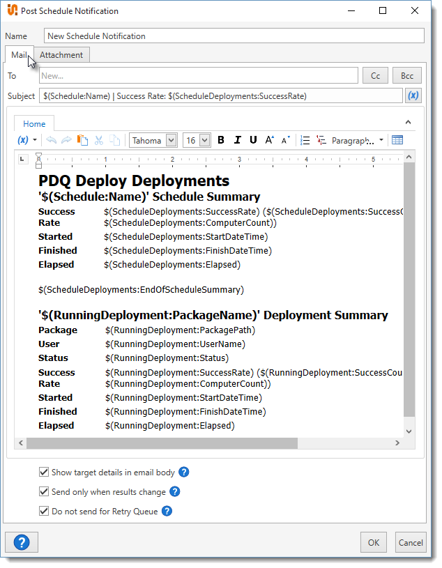 Provides full details of every deployment in a schedule in one email with one attached file (PDF by default) to designated recipients. This sends a notification only when the scheduled deployment results change and it does not send notifications for any deployments from the Retry Queue. |