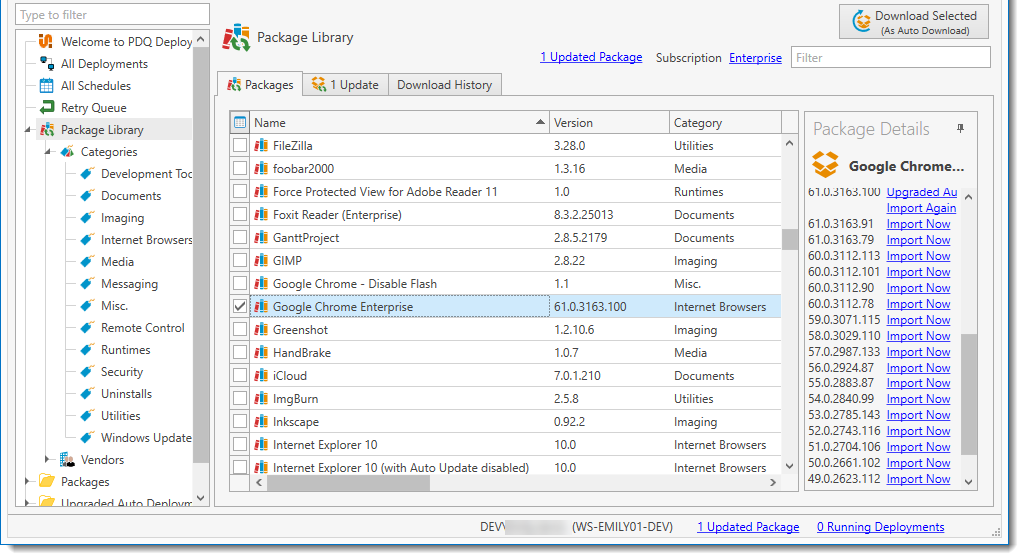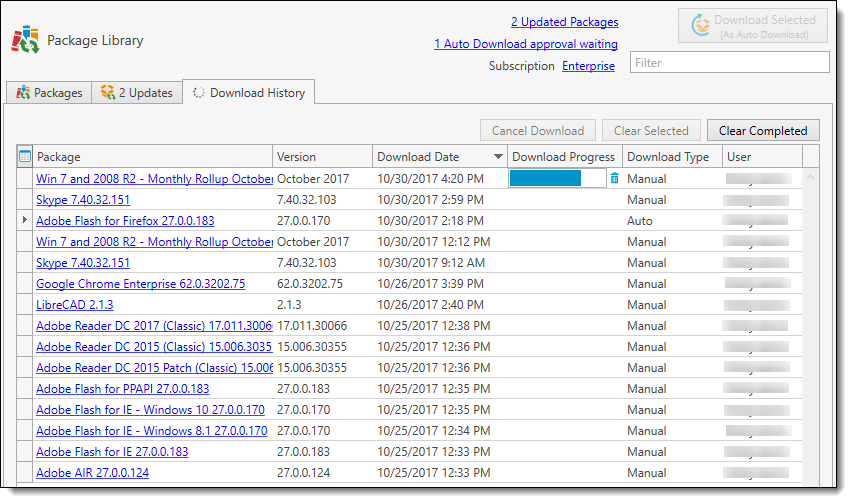 The Download History tab not only shows you downloads that are in progress, but keeps a running tally of all packages downloaded. This is particularly helpful for Auto Download packages that are automatically downloaded after approval. (Enterprise mode required for Auto Download.)
