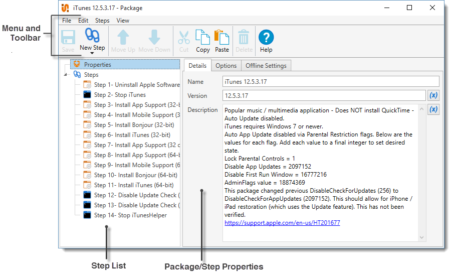 The Package window has three primary components—the Menu and Toolbar, the Step list, and the Package/Step Properties. Packages that are set to Auto Download will show Pre-Steps, the Steps of the Library Package, as well as the Post-Steps.