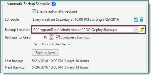 2.The backup location of the database is specified in Backup Location. By default, the backup database files are located in %PROGRAMDATA%\Admin Arsenal\PDQ Deploy\Backups.