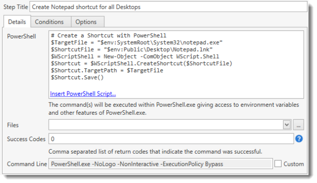 This will attach a PowerShell script (.ps1) file to your package and call that file from within the PowerShell Step. The included file will be listed in the Files field of the step. |