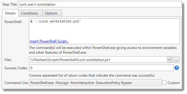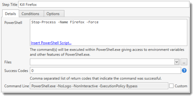 The success or failure of the PowerShell step is determined by its return code. A command is considered a success if the return code is listed in the Success Code box. For programs not native to PowerShell, PowerShell has a built-in variable called $LastExitCode that stores the last return code. This behaves similar to the %ERRORLEVEL% from a regular command line. For native PowerShell cmdlets, no return code is given. Any native PowerShell cmdlets that encounter an error will return a PackagePowerShellErrorException for the step. Note: The PowerShell step includes some basic error handling. For more detailed information on error handling, see PowerShell Error Handling. |