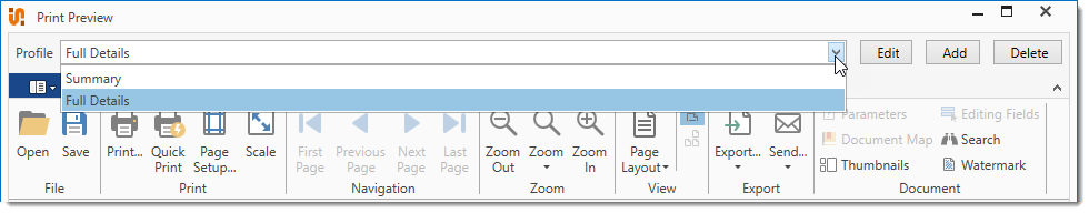 3.(Optional) To edit an existing Report Profile, create a new profile, or delete a profile, click Edit, Add, or Delete. Profiles can only be modified when you click on Reports to open the Print Preview window. (Enterprise mode required.)