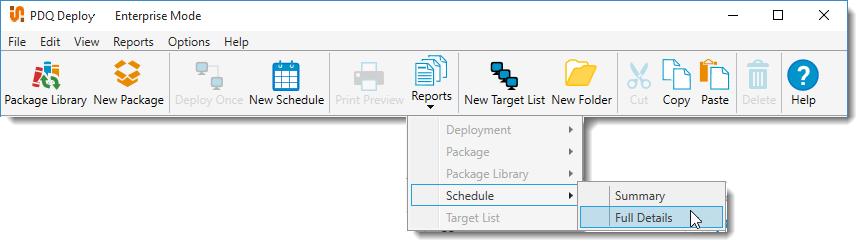 The following procedure shows how to generate and print reports in PDQ Deploy. You can print the active panel and grid in the console or several different prebuilt reports with different report profiles that vary based on report type. There are two report types with customizable report profiles: Deployment Details and Schedule Details. Enterprise mode is required in order to edit and create customized report profiles. For details about the built-in reports and report profiles, see Built-in Reports and Profiles. For information about customizing report profiles, see Customizing Report Profiles.