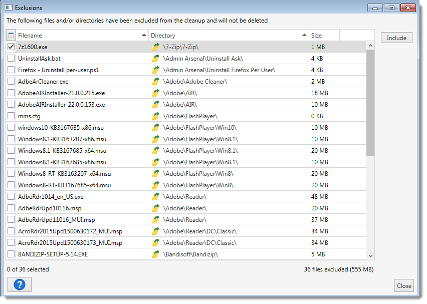 The name of the file that has been excluded from cleanup. If a directory has been excluded, this column will reflect all files and subdirectories. Checking the box next to filename will select it to be included. By default, the exclusions are empty. |