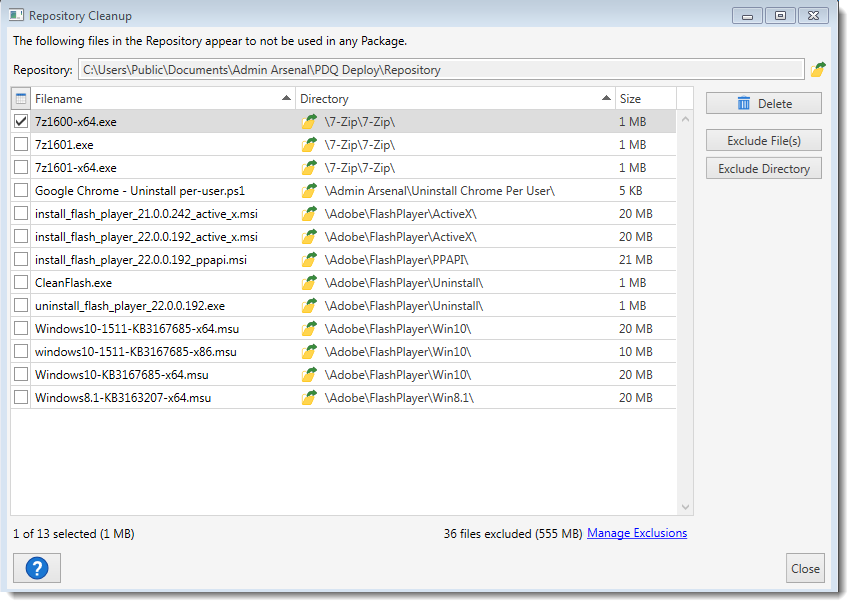 By default, PDQ Deploy indefinitely retains all downloaded package files, regardless of whether the package exists. Over time, the repository may consume large amounts of disk space. To cleanup old or unused files within the repository (PDQ Deploy Enterprise mode required), click Options > Preferences (or press Ctrl+Comma) and select Repository in the Preferences window. In the Repository Cleanup section, click on See Unused Files. Additionally, the unused files can be viewed from the Main Console status bar by clicking xx unused files in the Repository. This opens the Repository Cleanup window, seen below.