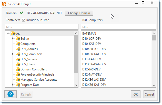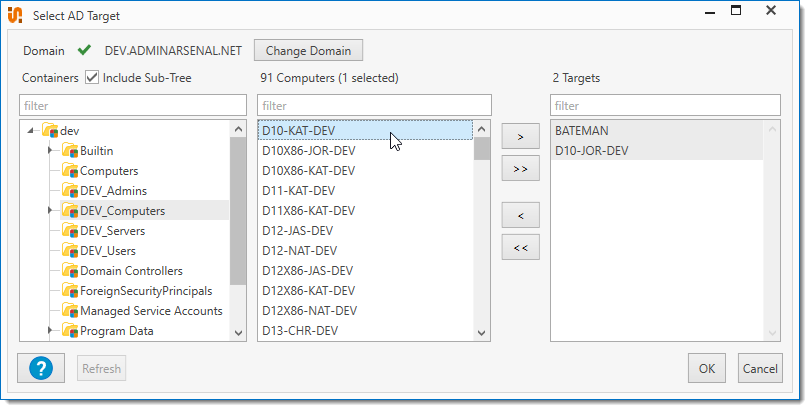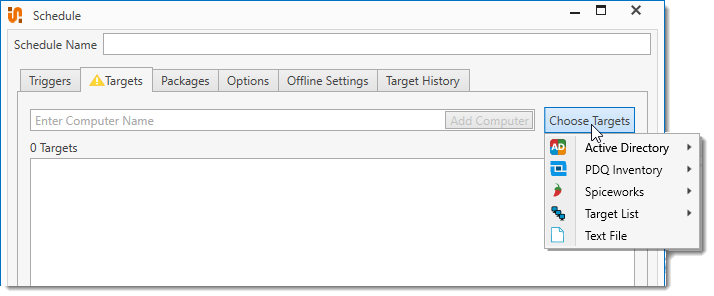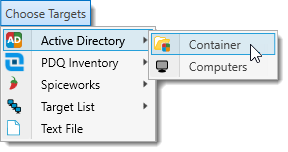 Choosing individual targets selects computers by name from target sources such as Active Directory (AD), PDQ Inventory, and Spiceworks. For example, if you select target computers from an Active Directory OU (Operational Unit) called Accounting, you will be choosing the individual computers from under the Accounting OU and not selecting the entire Accounting OU as one target. Choosing individual Targets is an option available in the Deploy Once window, the Schedule window, and the Target List window.
