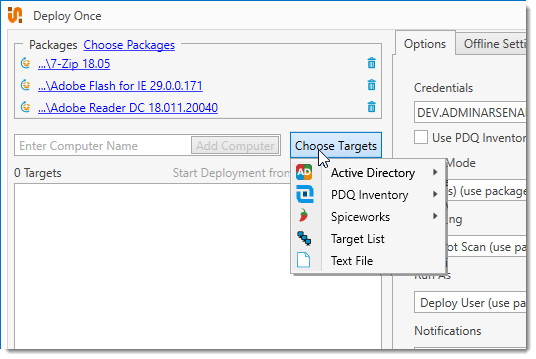 PDQ Deploy offers three ways of selecting targets for deployments; linking to sources of computers dynamically, adding individual computers from lists of existing computers, or manually adding them by typing in the computer names. Selecting targets is done in the Deploy Once window, the Schedule window, and the Target List window.