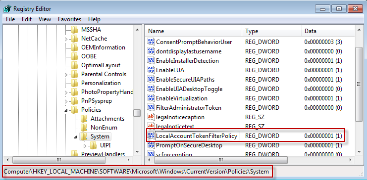 3.Create a DWORD value named “LocalAccountTokenFilterPolicy” and assign it a value of 1 as shown below.