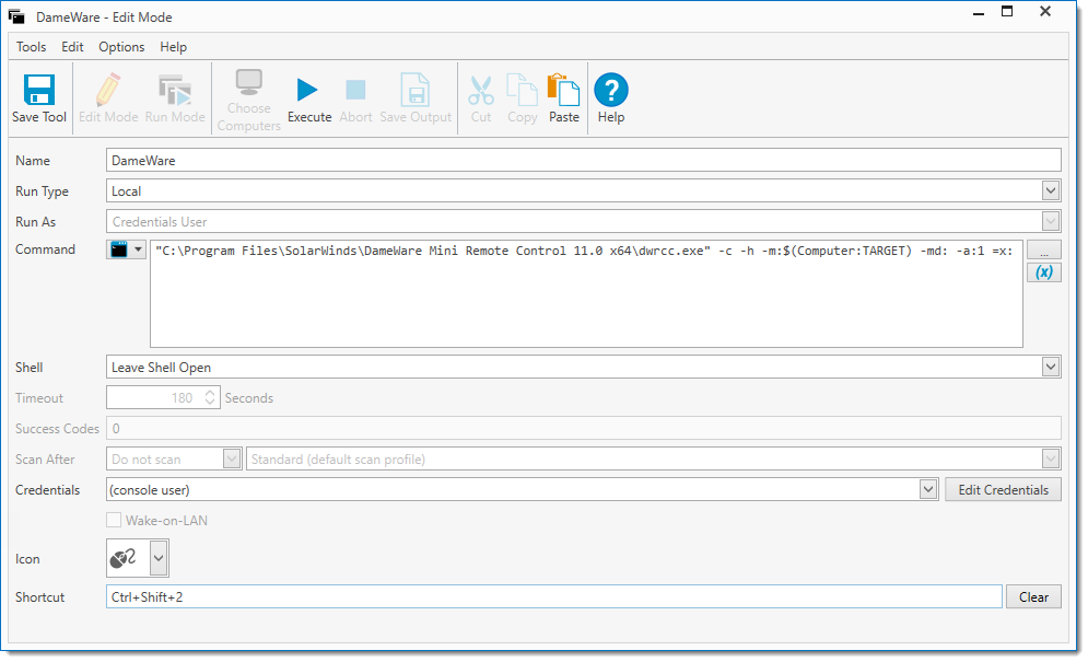 The example below shows a Tool which opens a DameWare 11 remote control session against a selected computer, using the Command "C:\Program Files\SolarWinds\DameWare Mini Remote Control 11.0 x64\dwrcc.exe" -c -h -m:$(Computer:TARGET) -md: -a:1 -x: