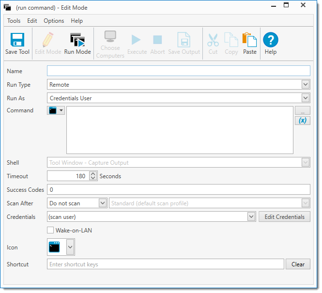 Tools are created within Edit Mode of the Run Command window. To access on the Main Console window click on Tools in the tree. On the Tools page, select the Tools Menu tab and click New > Tool.