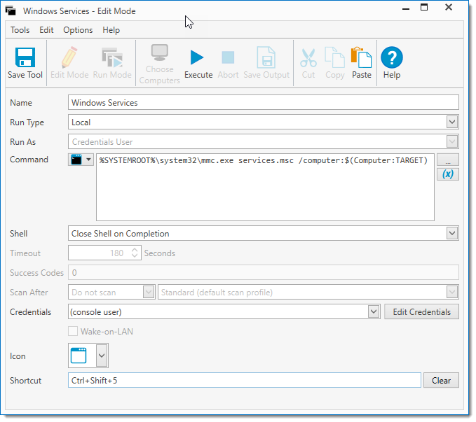 The example below shows a Tool which opens MMC and loads the Services.msc snap-in and connects to the selected computer, using the Command %SYSTEMROOT%\system32\mmc.exe services.msc /computer:$(Computer:TARGET)