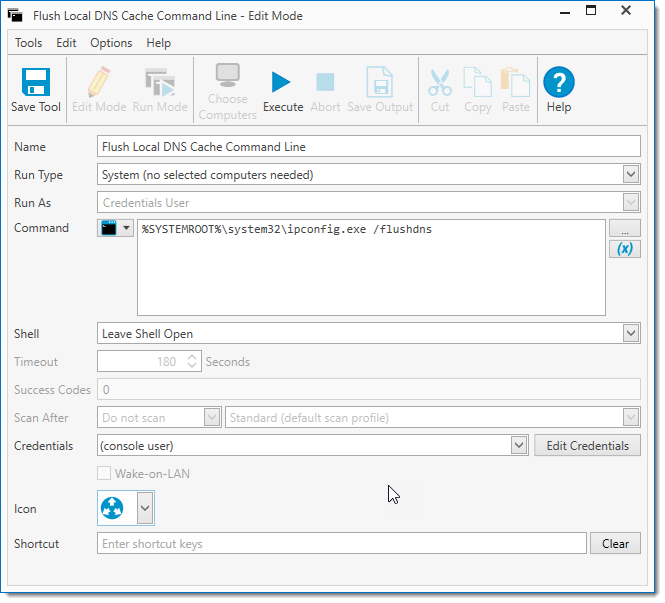 The example below shows a Tool which flushes your DNS cache in Windows, using the Command %SYSTEMROOT%\System32\ipconfig.exe /flushdns