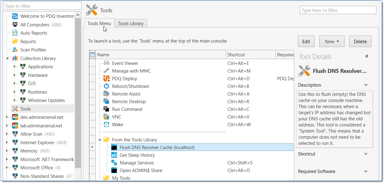 Tools are organized on the Tools Menu tab of the Tools page on the Main Console. To access, click on Tools in the Main Console tree and select the Tools Menu tab. This page lists all of the Tools that come with PDQ Inventory, are imported from the Tools Library, or are created by the user and can be used in the Tools menu. (Enterprise mode is required to edit Tools).