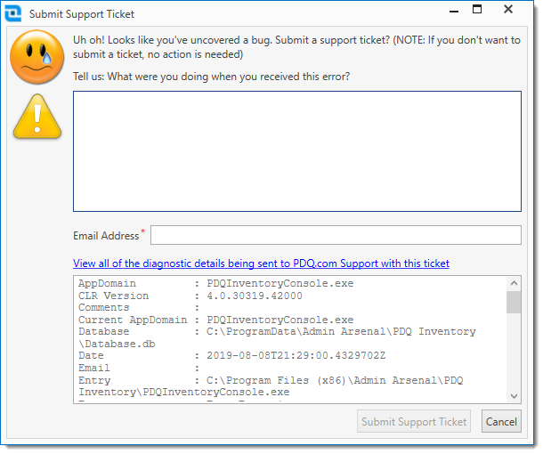 A text box allowing you to provide information to PDQ such as: what you were doing when the error occurred, were you able to replicate the error, any troubleshooting steps you performed, and other information you feel is pertinent to the error. NOTE: If you don't want to submit a ticket, no action is required. If you have Send anonymous exception data to PDQ.com selected in Preferences, we have already received an anonymized version of the diagnostic details and are aware of the problem encountered. If you wish to have PDQ.com Support to contact you, you will need to provide us with an email address at the bare minimum. |