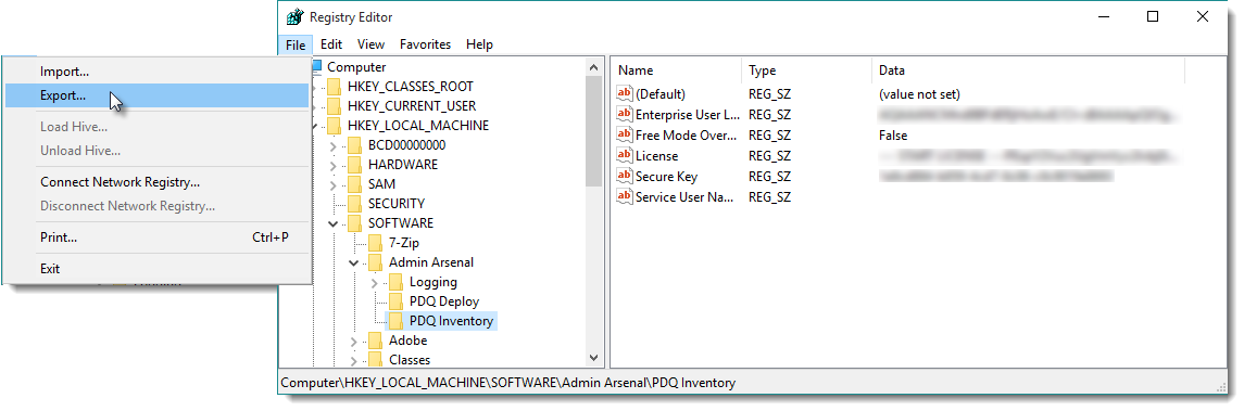 d.Copy the HKEY\Software\Admin Arsenal\PDQ Inventory key to the desktop on the new system.