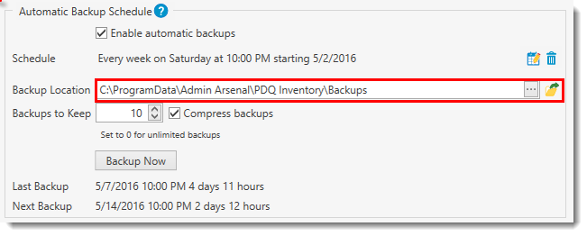 2.The backup location of the database is specified in Backup Location. By default, the backup database files are located in %PROGRAMDATA%\Admin Arsenal\PDQ Inventory\Backups.