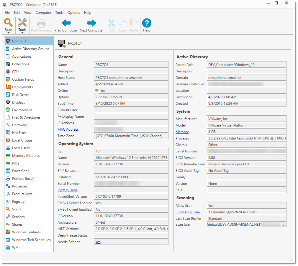 The Computer window is a very powerful resource that provides access to all the inventory data for a single computer. From the Computer window you can also start a scan, run a remote command, initiate a remote control session, launch PDQ Deploy and other admin tools, or print Computer window pages specific to a computer.
