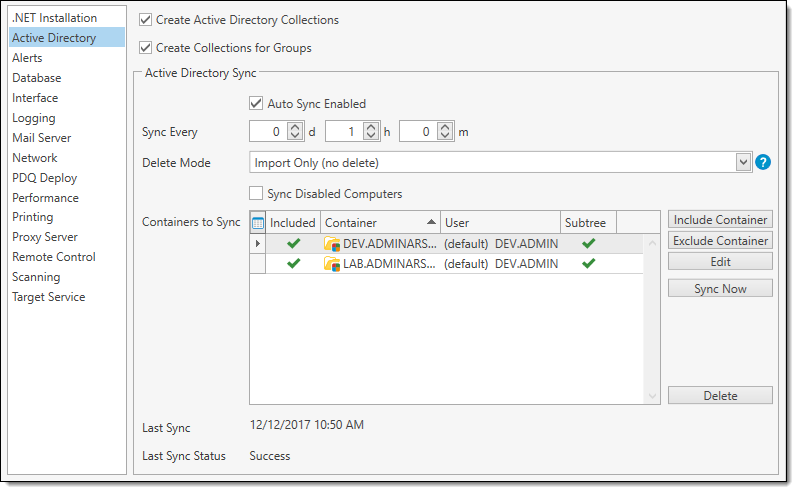 In Enterprise mode, you can add Active Directory computers automatically. In Preferences > Active Directory, click Auto Sync Enabled, select the AD Containers to include, then click Sync Now. Active Directory Sync is the preferred method for adding computers with AD because it can be configured to automatically sync them on a schedule to capture future changes made in AD. It can even add new computers to your PDQ Inventory database and AD collections when they are added to Active Directory. For details, see Active Directory Collections and Active Directory in Preferences. (Enterprise mode required to use Active Directory Sync.)