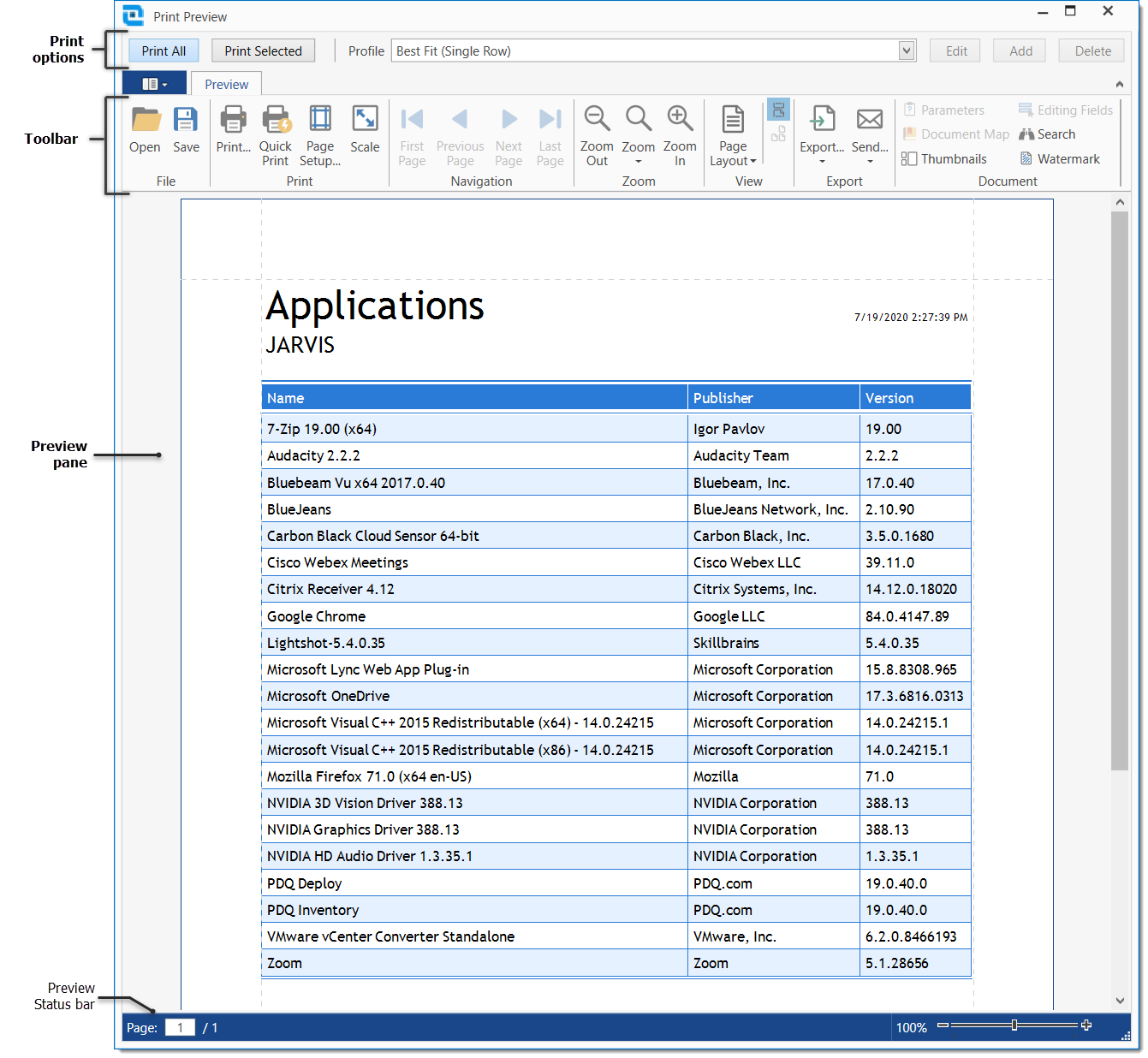 The Print Preview window allows you to print most grids in PDQ Inventory. The components of the Print Preview window are the Print options, Toolbar, and the Preview pane.