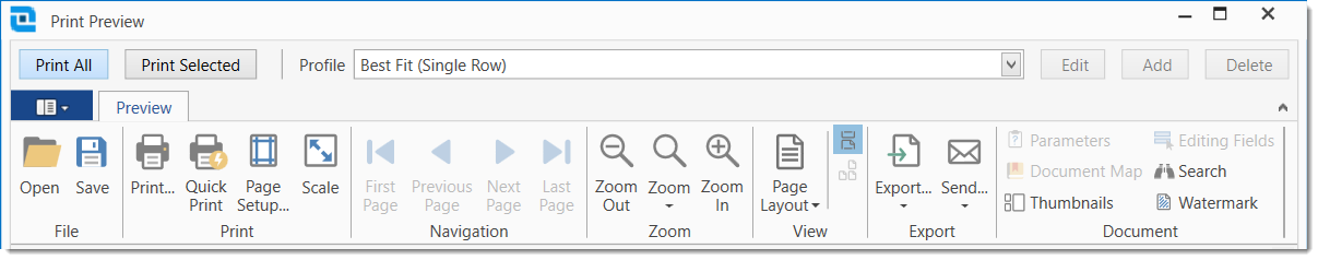 In the Print Preview window you can select the print options, view and control the output of the document, then choose to print or export the report. The following table provides quick reference for each print option.